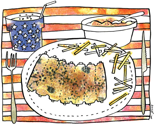 I was hungry, as I had not eaten since finishing the bacon cheeseburger I bought from the Wendy’s drive-thru on the way over, and so I ordered a full rack of BBQ ribs, with French fries, cinnamon apples, and an extra-large soda that was served in what appeared to be an overturned Darth Vader helmet. My parents forked their salads as I gorged myself with the meats and sweets of American mass cuisine, and my mother made me promise I would call if I needed anything: money, clothes, a subscription to a Jewish dating service — anything. But I grunted these concerns away, for I did not want to spoil with worry what was surely a perfect and perfectly American meal.