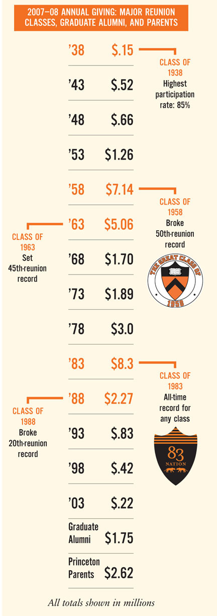Annual Giving broke the $50 million mark for the first time in 2007–08 as the campaign raised a record $54.1 million, up 10.3 percent from last year. The 25th-reunion Class of 1983 raised $8.3 million — an all-time record for any class. Other record-setters: the classes of 1958, 1963, and 1988, the graduate alumni, and Princeton parents.