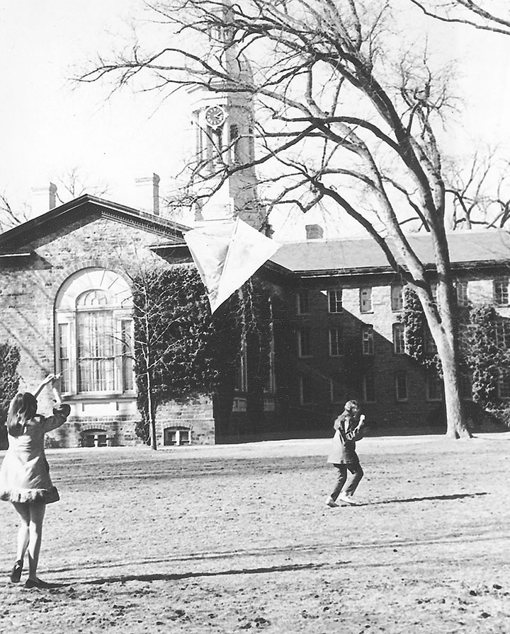 With spring approaching two students felt it was the right time to fly their kite on Cannon Green. Can you identify the students in this undated photo? Do you have any campus kite-flying experiences to share? Let us know at paw@princeton.edu.