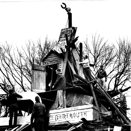 Maybe the victory bonfire under construction here was the charm that gave the Tigers their 13–7 victory over Dartmouth in 1950. Or perhaps it was the coffin-like “Bed for Dartmouth” that put fear of the Tiger into the Big Green football squad. It didn’t take a bonfire Nov. 17 to help this year’s team score another Dartmouth win; the Tigers defeated the Big Green 17–14 in overtime. Perhaps some PAW readers can identify the students hard at work in this photo.