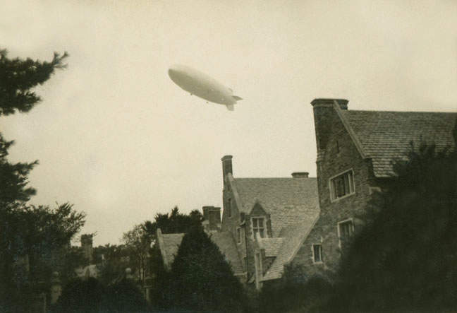 The late Thornton Gerrish ’37 used his Kodak Brownie camera to shoot this photo of the Hindenburg airship as it flew over Princeton’s campus May 6, 1937, shortly before it caught fire while docking in Lakehurst, N.J., killing 36 people. The Hindenburg was destroyed within one minute and turned public opinion against travel by commercial airship or dirigible. Haden Gerrish ’79 submitted the photo, and after collaborating with his brother, Campbell ’73, recalled that their father was shooting from the window of his Pyne Hall dorm room in the direction of Henry Hall.