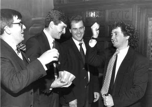 Though Princeton didn’t win the World Universities Debating Championship (or “Worlds”) in January 1989, it didn’t stop these unidentified debate club members from uncorking some champagne to celebrate. Princeton hosted the event, which was attended by more than 100 teams and had an increased international presence. The University of Sydney (Australia) took the crown that year and the topic for debate was “socialism has failed” — a prescient choice in light of events in central and eastern Europe later in 1989. Can any PAW readers name these students?