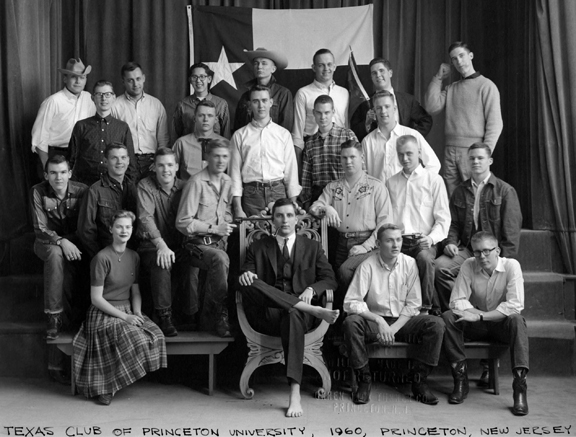 Head Wrangler Franklyn A. Harris ’60 (aka “Tex”) posed without his cowboy boots in this 1960 photograph of the Texas Club of Princeton. Other students from the Lone Star state surrounding Harris’ thronelike chair include F. Walter Conrad ’61 (possibly at far right in top row) and James R. Diaz ’61 (possibly at far left in the top row), according to archivists. The late Orren Jack Turner, a lifelong Princeton resident, took the photo. The University’s Office of the Dean of Undergraduate Students currently lists a “Texans Club” that sponsors “social events for Princeton students from Texas.” Can any readers identify other Texan students and the only woman in the photo — or remember what happened to Harris’ boots?
