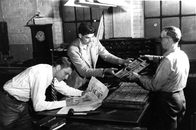 Hot type and another late night (the clock reads 12:55 a.m.) are vintage Daily Princetonian from the days when production took place at The Princeton Herald (a now-defunct local paper) offices on Chambers Street. Archivists provided no information about this photo, which shows the old composing room with its trays of metal type. In 1971, Prince trustees voted to abandon the Herald and its outdated equipment and switch to “cold” offset-printing technology, thereby entering the computer age. The offset operation was on the third floor of 48 University Place, the Prince building. Can any PAW readers identify these students, the Prince employee (right), or date the photo?