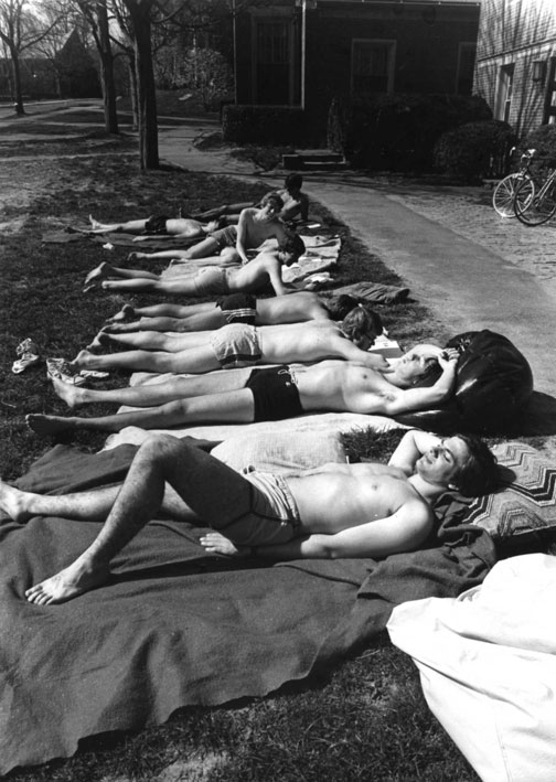 Flowers and chirping birds aren’t the only signs of spring on campus. Shorts, flip-flops, and sunbathers blossom everywhere on a warm 2012 day, just as they did when this photo — perhaps from the 1960s or 1970s — was taken for PAW. The building visible at top right appears to be 1915 Hall, but archivists provided no details about the photo. Can any readers identify these tanned and trim students?