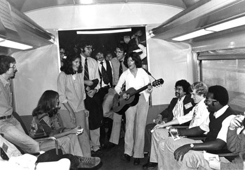 It may have been a fight tune these Princetonians were singing aboard the Orange, Black, and Crimson Express on their way to Boston’s South Station Nov. 8, 1975. According to The Harvard Crimson, Princeton’s sophomore, junior, and senior class committees bought 150 student seats on a train to the Harvard game but sold only 40, costing the classes approximately $2,400. Buying the cars “seemed like an F. Scott Fitzgerald thing to do,” student government president James P. Kelly ’76 said at the time. Freshman class president Richard Grove ’79, whose class went to Harvard via bus, explained that poor sales were due to declining student interest after Princeton’s three losses to Penn, Brown, and Colgate — as well as the high price of the ticket, $23. Can any PAW readers identify these fans?