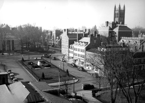 Some things change, and some remain the same. Palmer Square retains the vintage look it had when its construction was completed in 1941, although mature trees and other plantings now obscure much of the view facing Nassau Street. The bronze tiger memorial, which was dedicated in 1944 to developer Edgar Palmer 1903, is visible at the center of the grassy island in this undated photo. Holder Hall is partially visible across Nassau Street, and the spires of Holder Memorial Tower peek over all buildings in the foreground. Though businesses have come and gone in the last 75 years, the Silver Shop still is operating in the location it occupied when Palmer Square’s western section opened in 1937.