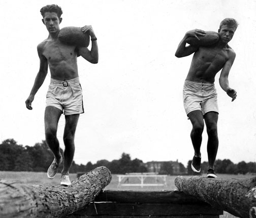 Students navigate an obstacle course while shouldering what appear to be sandbags in this photo archivists date to between 1941 and 1945. During World War II, Princeton set up a physical-training program that stressed conditioning for war service, but a lack of undergraduates on campus — at the lowest point during the war, the number of civilian students fell below 400 despite a plea from President Dodds to stay in school rather than sign up for military service — stretched the University’s finances to the breaking point. To stay viable, the University opened its doors to the military, establishing the Naval Training School (or V-12). Can any PAW readers identify these physically fit men?