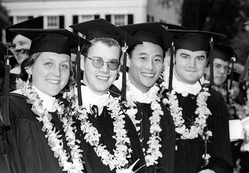 Archivists titled this photograph simply “happy grads with leis.” They also provided the date it was taken: June 3, 1997, Princeton’s 250th Commencement. The University conferred degrees on 601 undergraduate men and 485 women that year, and awarded 606 advanced degrees. Fred Hargadon, then dean of admission, addressed grads at Class Day, and Sen. William Frist ’74 was Baccalaureate speaker. Can any ’97ers identify the classmates pictured?