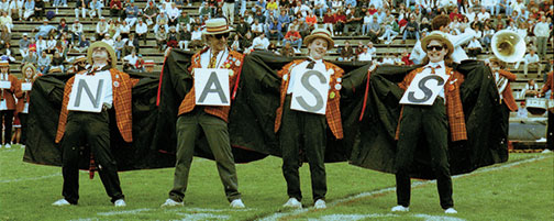University Band members display their Tiger spirit during the halftime show of the final Princeton-Harvard game played in Palmer Stadium, Oct. 26, 1996. The stadium, which opened in 1914 with a game against Dartmouth, was demolished in March 1997 because of irreparable steel erosion. The last game in Palmer also was against Dartmouth — the Tigers lost 24–0. But in the Sept. 19, 1998, opener in the new Princeton Stadium, the Tigers defeated Cornell 6–0. University photographer Robert Matthews took the pictures of these unidentified students. Can any PAW readers provide their names?
