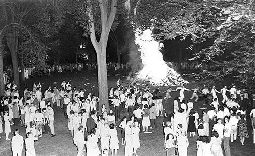 “The war is over!” read the headline under this Edward W. Rothe ’48 photo of the bonfire built on campus on V-J night in 1945. Rothe, a student photographer during World War II and founder of the Princeton Photo Agency, recently provided his original print to PAW, which published it in the Sept. 28, 1945, issue. According to the photo caption, the bonfire built “around the cannon” climaxed the day’s celebration while “relays of undergraduates, faculty, and townspeople tolled the Nassau Hall bell for nearly four hours.” Can any PAW readers remember participating in this event?