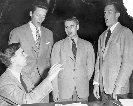 These dapper young members of the Princeton Glee Club rehearse with their director in a time-delay photo (now torn) set up in 1947 by Edward W. Rothe ’48, shown at center. Rothe was a student photographer and founder of the Princeton Photo Agency. He cannot recall the names of the other singers or the director, but perhaps some PAW readers can identify them.