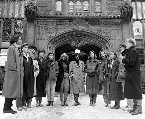 It was 30 years ago — on Feb. 2, 1985 — when Bob Matthews of the University’s communications department photographed these unidentified Tigerlilies singing in front of East Pyne. Though their shoulder pads betray the decade, their straight ankle-length pants and footwear still would be fashionable today. And who doesn’t own a down jacket? Can any PAW readers name the women?
