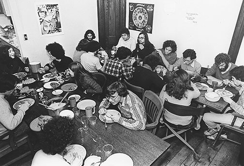 Students chow down at 2 Dickinson co-op in this undated photo by W.L. (“Bill”) Allen ’79. A vegetarian and vegan-friendly dining option, Dickinson was founded in 1977 after a group of independent students pushed for an alternative to University dining halls and eating clubs. William Braham ’79, a founding member, told The Daily Princetonian in 1996 that one of his Dickinson favorites was “garbage soup, which was made on a Sunday night from all the leftovers of the week.” Tastes have changed over the years: Recent meals at the co-op have included mushroom risotto, vegetable sushi, avocado salad, curries, and dal.