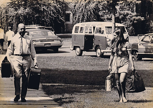 Parents carrying suitcases, cars filled with dorm-room essentials, anxious and excited students — all are part of a scene repeated every fall: moving-in day. Archivists did not identify this family or the year of the photo, but the cars indicate it was taken during the early years of coeducation at Princeton. Alexander Stuart ’72 shot the photo during Freshman Week. Can any readers name this student or her dad?