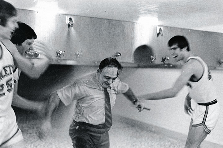 Unidentified basketball players have some fun showering coach Pete Carril after the Tigers defeated Brown 70–59 on Feb. 28, 1976, clinching the Ivy League championship for the first time in seven years and thereby gaining a bid to the NCAA tournament. Carril spent 29 years as Princeton’s head basketball coach, leaving in 1996 for the NBA. Stuart Crump Jr. of Princeton took the photo. This year men’s basketball begins Nov. 13 with an away game against Rider University. Can any readers identify these players?