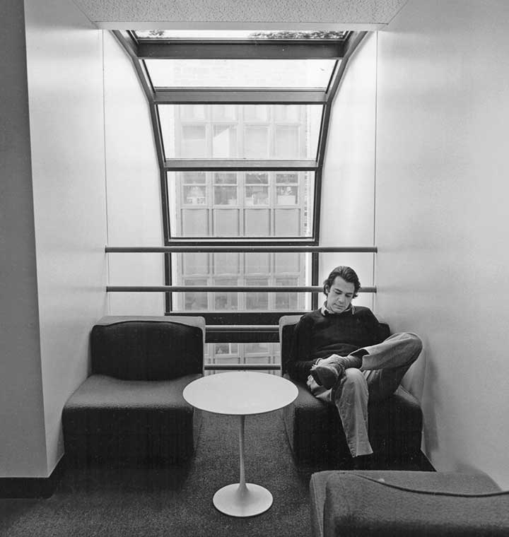 In 1979 construction of Hoyt Lab was completed. Pictured is a small lounge that offered a three-story view of what was then Frick Chemistry Lab. Do you have any special memories of Hoyt? Do you recognize the person in the photo? Let us know at paw@princeton.edu.