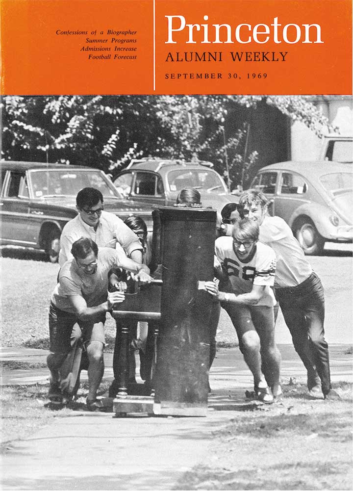 In the fall of 1969, PAW’s cover pictured Ray Ollwerther ’71 (right front) and several dormmates moving his piano from Holder Hall to Blair Hall. Among those shown are Bob Tygenhof ’72, Pandelis Glavanis ’71, Ed Smith ’71, Vangelos Mageirou ’71, and Bob McBain ’71. This is Ray’s final issue as PAW managing editor (see editor’s letter).