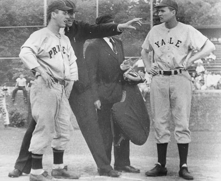 From 1906 to 1967, a varsity baseball game followed the P-rade. In 1948, the Princeton team, captained by John Meeker ’48, left, played Yale with George H.W. Bush, right, at first base.