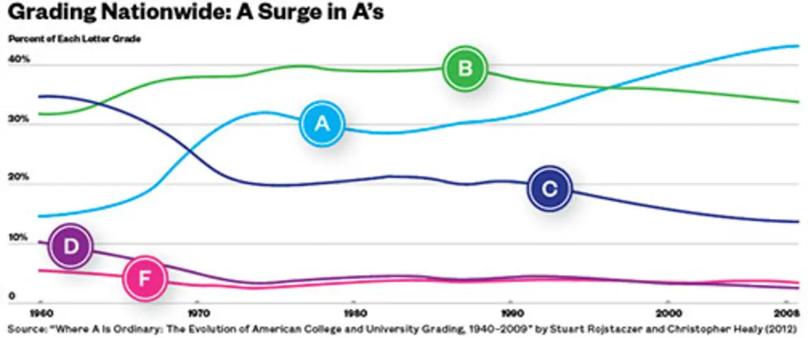 Grade inflation has long been a vexing problem across higher education. A study by Stuart Rojstaczer and Christopher Healy of grading data from 200 four-year colleges and universities from 1940 to 2009 found that A’s represent 43 percent of all letter grades on college campuses, up from 15 percent in 1960 and 31 percent in 1988. The total of D’s and F’s, meanwhile, has decreased to less than 10 percent.