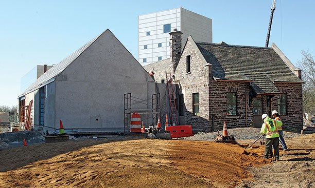 Alumni returning to campus for Reunions will find that construction of the Lewis Center for the Arts, between the Dinky station and McCarter Theatre, is in its final stages. Pictured at left in the photo above is the music building, which will house a large rehearsal room and smaller practice rooms and teaching studios suspended from the roof to provide sound isolation. The six-story tower to the right will include a dance studio, art gallery, box office, arts library, and administrative offices. The Wallace Dance Building and Theater, located in the cylindrical structure at right rear and in the rectangular building in the center to which it is attached, will house a black-box theater, a dance theater, faculty offices, and acting studios.