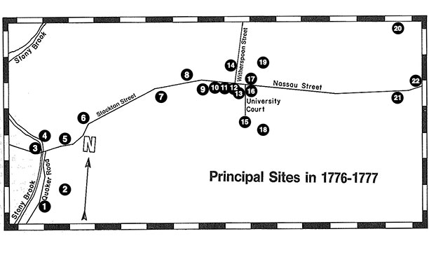 18. Farm of Jonathan Sergeant. Treasurer of the college, Sergeant bought this farm from his son-in-law Jonathan Baldwin 1755 and died there of smallpox during the British occupation. The farm, which was pillaged by the enemy, included the land on which Palmer Stadium now stands.