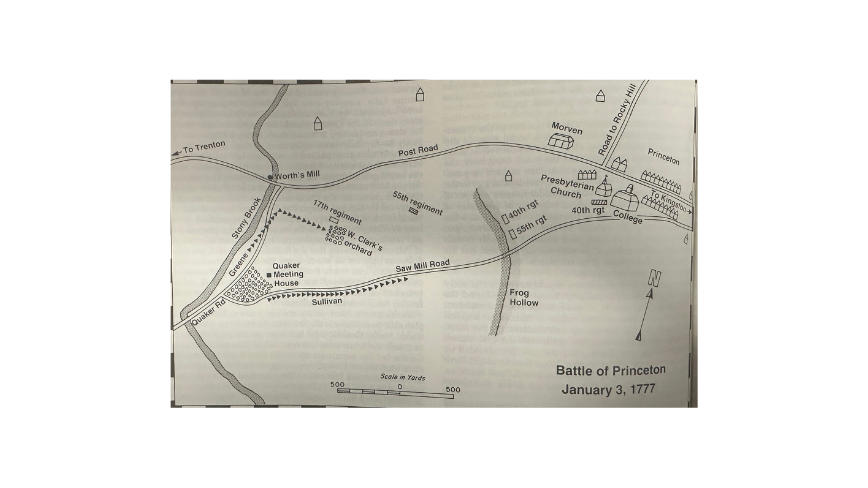 Here Washington paused to arrange his troops in columns for the attack on Princeton, basing his dispositions on the intelligence reports he had received over the past few days, which assured him that the back side of town was entirely unprotected. On December 30, a mounted scouting party, eld by Colonel Joseph Reed ‘56, had learned that the roads south of the college were virtually unparalleled. A day later Washington had actually received a map, prepared by an “intelligent young gentleman” who had just slipped out of Princeton, showing that the British had, in fact, prepared defenses only for an attack along the main highways leading directly into town. Furthermore, this map showed the existence of a disused track, the Saw Mill Road, which branched off the Quaker Road and led through those undefended fields behind the college.