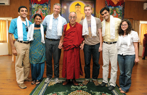 As Members of Princeton’s RELIGIOUS LIFE COUNCIL, an undergraduate group committed to religious pluralism, met for an hour with the Dalai Lama (center) at his residence in Dharamsala, India, in July. From left are Nikhil Bumb ’08, Deepa Iyer ’09, associate dean of religious life Paul Raushenbush, Olaf Sakkers ’11, Manav Lalwani ’09, and Esther Breger ’10. The visit followed an eight-day trip to religious sites in India by 22 members of the council. Sakkers described the Dalai Lama as “acute in intellect and intensely present, never distracted, and yet filled with laughter.”