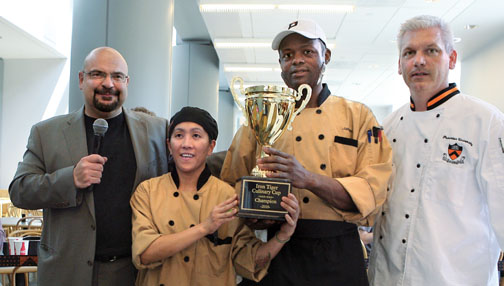 TASTING VICTORY Butler/Wilson College dining hall chefs Emily Capunpon and James Sims, center, celebrate with the Iron Tiger Culinary Cup after winning the Iron Tiger Throwdown at Frist Campus Center. The event pitted six teams representing the residential dining halls and the Frist center in a contest of “Ultimate Wing” recipes. At left is Dining Services director Stu Orefice and at right is Rob Harbison, Dining Services’ culinary concepts coordinator.