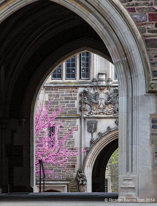 An Eastern redbud tree adds color to an early May view of Holder Hall (foreground) and Campbell Hall archways. Photograph by Ricardo Barros