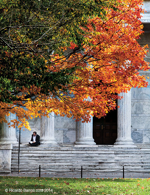 The marble columns and exterior of Whig Hall provide a stately backdrop for the fall foliage in this view from Cannon Green.