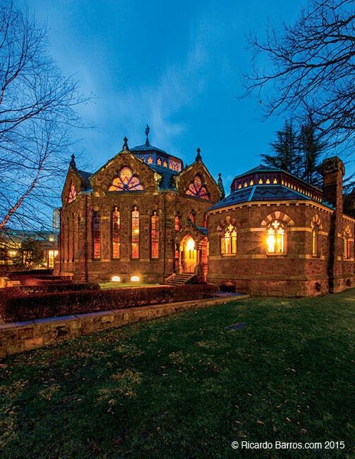 The stained-glass windows of Chancellor Green glow at twilight. Opinions of its Victorian Gothic design have varied widely over the years (see From PAW’s Pages).