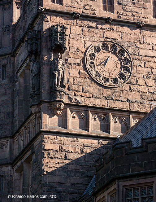 A statue of Oliver Ellsworth 1766, the nation’s third chief justice, looks out over campus next to the sundial on East Pyne’s red sandstone tower. Photograph by Ricardo Barros