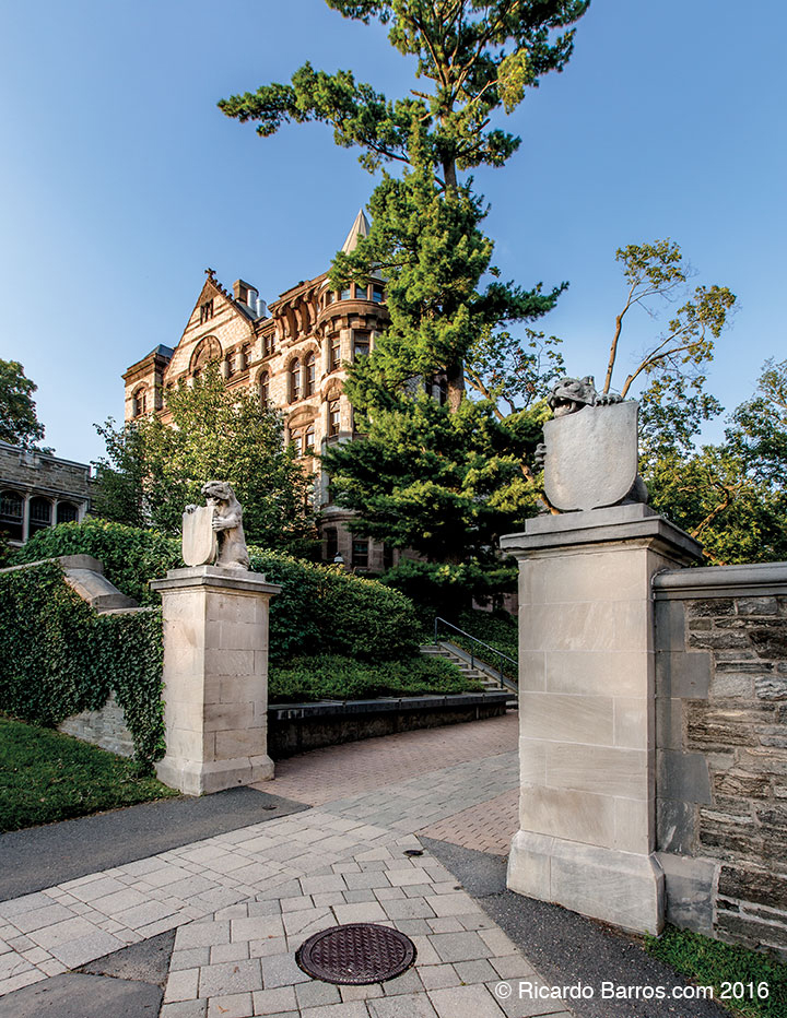 Sometimes called the Tiger Gateway, two stone gateposts topped by fierce-looking tigers mark the start of McCosh Walk between Blair and Little halls. Behind are the varied colors and shapes of Witherspoon Hall. Photograph by Ricardo Barros