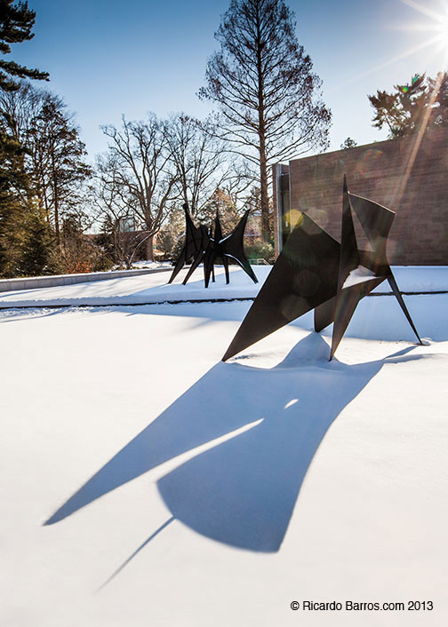 Two sculptures by Alexander Calder, “Man” (left) and “The Kite That Never Flew,” contrast with a blanket of January snow in front of the University Art Museum. The works are on loan through June 15.