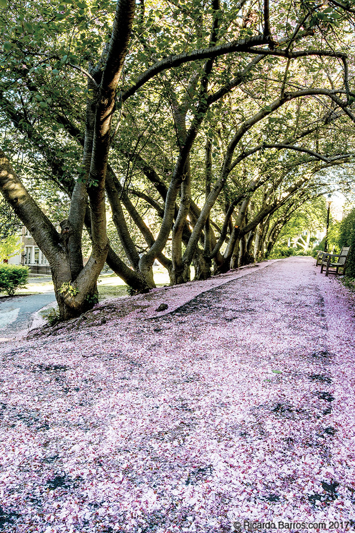 Kwanzan cherry tree blossoms turned this allée between Eno Hall and McCosh Health Center into a river of pink in early May.