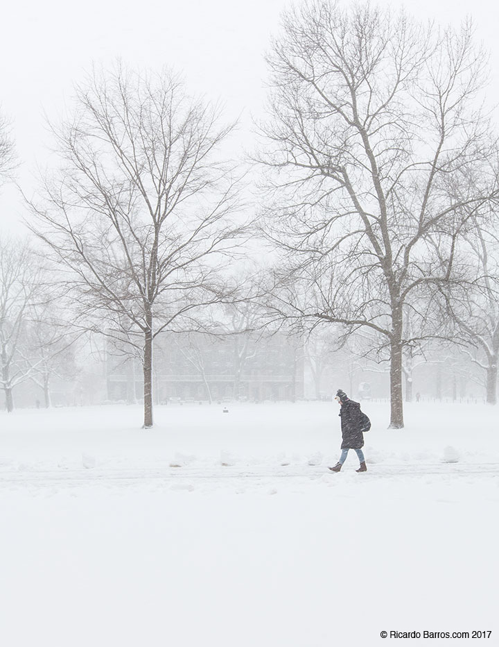 A Feb. 9 snowstorm transformed the view across Cannon Green toward West College into shades of white. Photograph by Ricardo Barros
