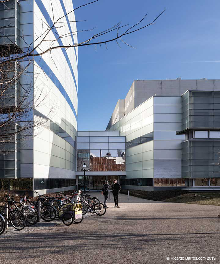The winter sun glints off Peretsman Scully Hall, left, which houses the psychology department, and the Princeton Neuroscience Institute. Part of Icahn Laboratory, located across Pardee Field, is visible in in the reflection at center.