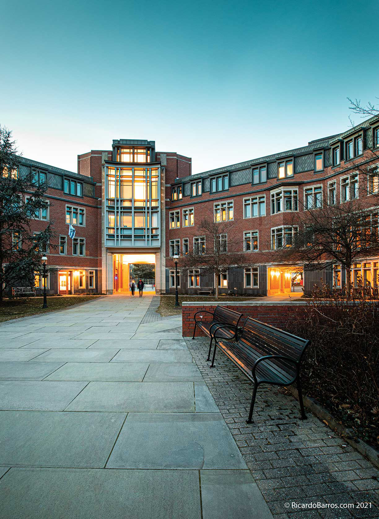 With about 2,900 undergraduates living on campus, dormitories like Bloomberg Hall, seen here at dusk in late January, are showing signs of life. Alumni may recognize the path as part of the P-rade route.