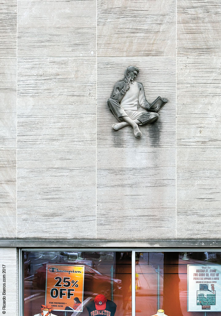 Above a U-Store display window, a student ponders a book in one of the building’s three bas-reliefs created by Adlai S. Hardin ’23. Hardin also created and donated the Class of ’23 silver cane, presented each year to the oldest member of the earliest class at Reunions.