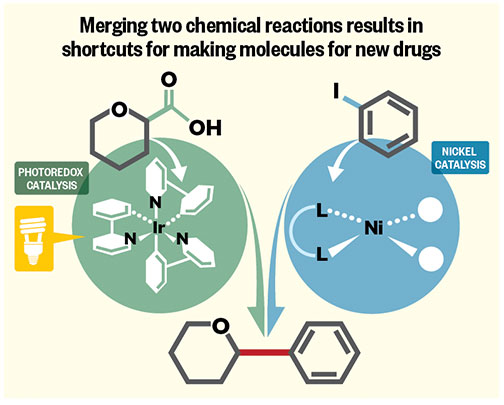 One of the benefits this provides for the pharmaceutical industry is the ability to use carboxylic acids — a ubiquitous chemical in biological compounds — as a handle to connect two different molecules. “There were not previously known ways to make this happen,” says MacMillan.