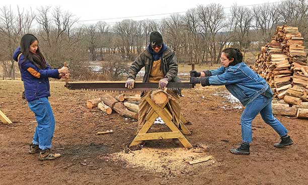 The group crossed a muddy field to the next stop on the maple-sugaring tour, where they watched another guide tap a spile — used to draw sap — into a tree. After successfully tapping their own tree, the group moved to a room with boiling equipment to learn about the evaporative process and the different products made on the farm using maple syrup. Then it was time to sample pancakes, churn butter, and chop firewood before piling into a van and heading back to campus.
