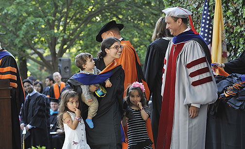 New graduate-school dean Sanjeev Kulkarni congratulates Sarit Kattan Gribetz ’06 *13, who received a Ph.D. in religion and brought her three children to the hooding ceremony to celebrate. Norman Augustine ’57 *59, a retired chairman and CEO of Lockheed Martin and a former Princeton faculty member, told the nearly 1,000 graduate students, “Your presence here today implies that you are equipped not only to play a leadership role in shaping this new world, but that you have an obligation to do so.”