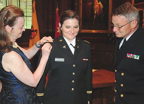 Kelly Ivins-O’Keefe ’14 stands during the ROTC Officer Commissioning Exercises at Nassau Hall June 2 as her mother, Vicki O’Keefe, pins shoulder bars on her uniform. Her father, retired Navy Capt. Gordon Ivins, looks on. Also commissioned were Jacob Herskind ’14 and Nicholas Mirda ’14. President Eisgruber ’83 congratulated the three as “worthy inheritors of the history and the ideals that course through this building.” Herskind received the George C. Marshall Leadership Award, presented to outstanding cadets nationwide.
