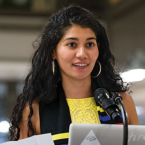 Yessica Martinez ’15, one of the two winners of the Pyne Prize this year, reads from her poetry at the ceremony for Latino and Latina graduates May 31 in Frick Chemistry Lab. About 150 people attended the bilingual event celebrating the achievements of the graduates and showcasing Latino culture. Julio Enrique Rivera ’76, a former dancer who now is a life coach, gave the keynote address.