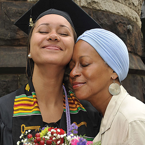 Emily McDonald ’15 and her aunt, Christiane Berry ’81, savor a moment together following the Pan-African graduation ceremony May 31 in Richardson Auditorium. “Utilize your privilege to open doors for those that are less privileged, in ways that uplift your communities and in ways that enrich black lives,” said Joanna Anyanwu ’15, a recipient of the Spirit of Princeton Award. Marc Lamont Hill, a Morehouse College professor and television host, was the keynote speaker. About 200 people attended the event.