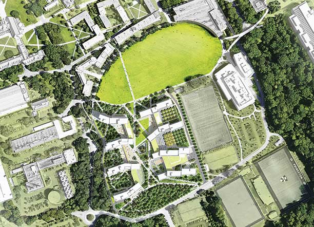 Each of the two new colleges will have four wings of residential halls that will shape three courtyards, University Architect Ron McCoy *80 said, and each will have its own dining hall that will open to a shared courtyard. Some dorms will have “green” roofs, and some will offer outdoor terraces for students. A central courtyard, called College Walk, will bring together the two colleges.