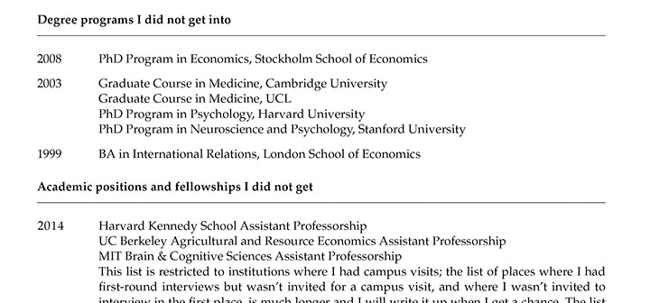 “Most of what I try fails, but these failures are often invisible, while the successes are visible,” Haushofer wrote. “I have noticed that this sometimes gives others the impression that most things work out for me. … This CV of Failures is an attempt to balance the record and provide some perspective.”