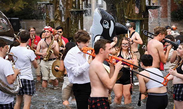 Campus march-around Every Saturday home game, we go around campus making a lot of noise, telling people to come to the football game and trying to get people hyped up. We start from the stadium, then we go to Frist. We play a version of “Tequila” in the late-meal area, then we go up the stairs and we play “Rock Lobster.” They’re songs we don’t even have written down, but people just learn them and teach all the new members. During one part of “Rock Lobster,” a signature band thing is that everyone lies down on the floor and “lobsters” — moving your legs up and down. It’s a pretty interesting sight!