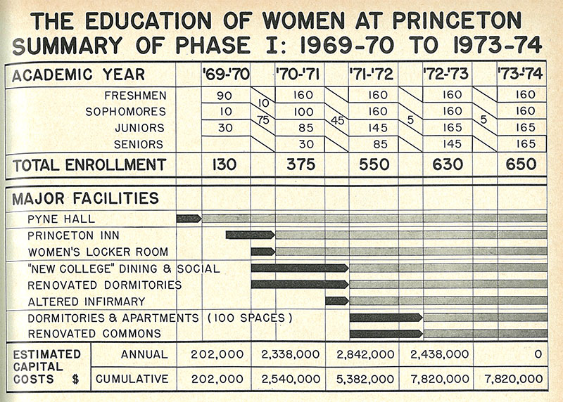 When Princeton’s Board of Trustees committed to undergraduate education in January 1969, President Robert Goheen ’40 *48 said the admission of women that spring was unlikely, given the challenges of facilities and finances. But by April 20, many of those hurdles had been cleared, allowing Goheen and the trustees to announce “phase one” of Princeton’s coeducation plans, beginning in the fall semester, complete with charts and graphs. PAW covered the news in its May 6, 1969, issue.